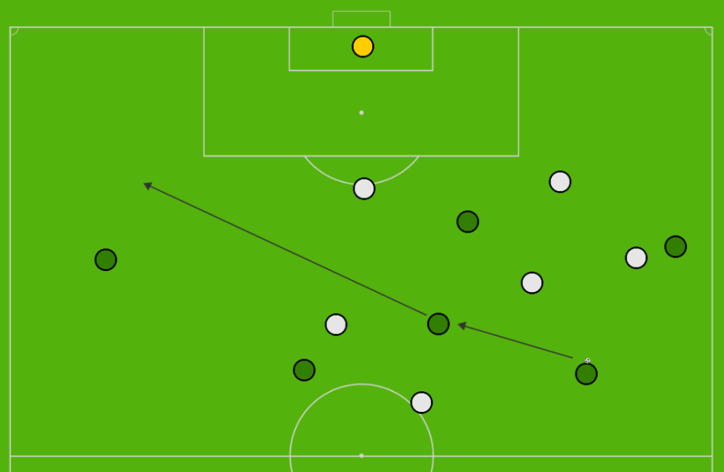 In order to switch the play from one side to the other as quick as possible, players also need to ensure they are not in the same passing lane as anyone else on their team. Ideally, the switch will be accomplished in one-two passes. If for example the left defender on the image above ran into the path of the central midfielder’s pass, the team would lose time by needing to now make another pass to the left winger. For older teams this could even extend to the central midfielder in the image, as the right defender may have been able to switch play from one side to the other without needing the midfielder, if only the space had been vacated.