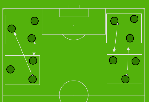 Set-Up/Execution: 4 groups of 3 or 4. Players start by passing to players in their own box. Coach calls a number, which tells players which direction to play the ball to, as one player passes the ball to another box and then follows that pass, joining the new box and getting started with the short passing right away. 1 = vertical pass (as shown). 2 = horizontal. 3 = diagonal. Slowly introduce these. Start with one, then add more. Best for Attacking Transitions.