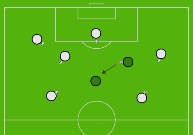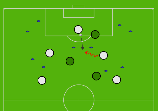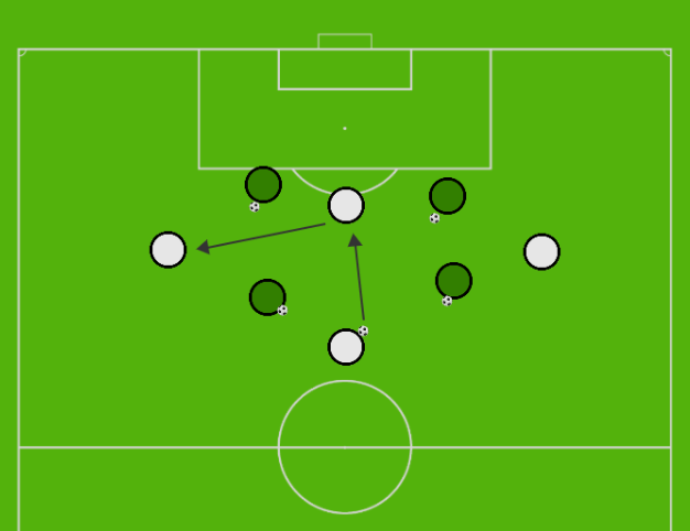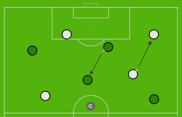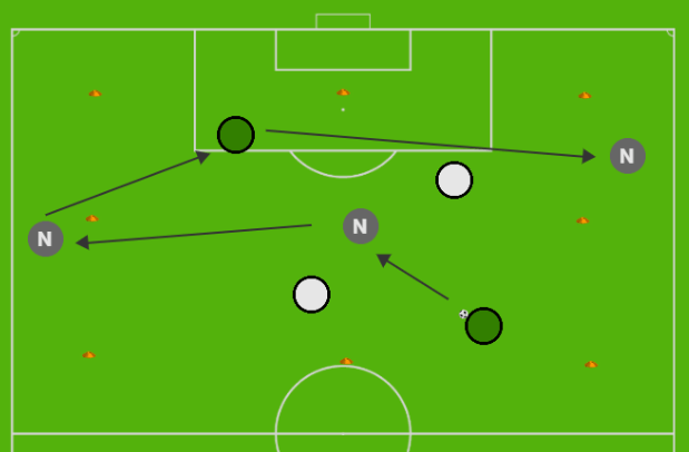 Setup/Execution: 2v2 + a neutral in a tight central grid. Two neutrals up and down a line on the outside. Just keep possession, looking to switch play from one side to the other to get a point.