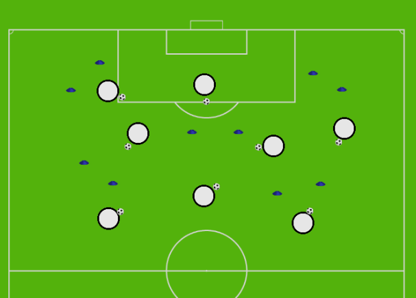 Setup/Execution: First, pass and move with ball in a pair of two. Then not long after, progress to now you can pass to anyone that is open, then try and find a new ball. For older players, you can increase the challenge by making it two/three touch or weak foot.