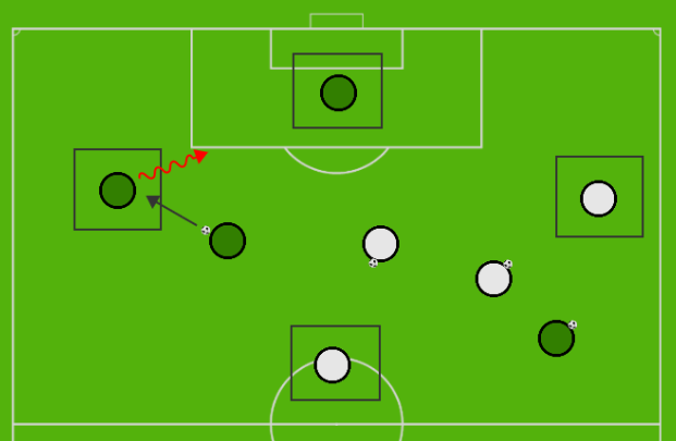 – Maximize space by making the field bigger when in possession, but always give a few close options too.