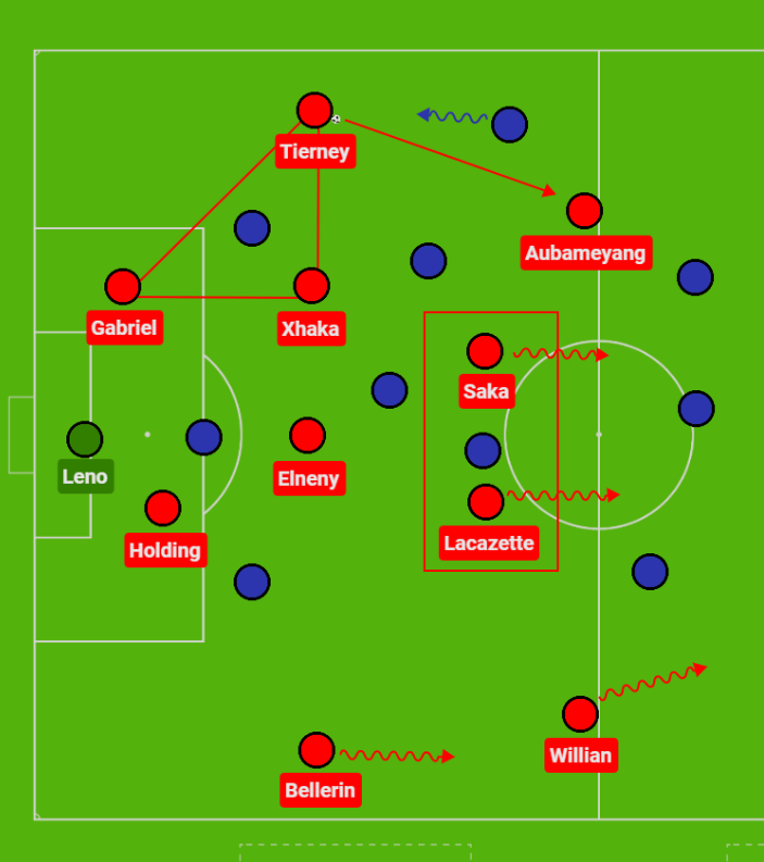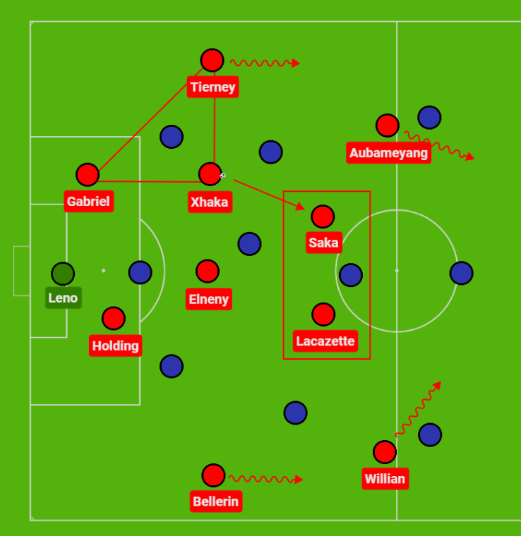 Firstly, the Gunners create triangles on both sides of the field. They look to get Xhaka and Elneny/Partey in line with Gabriel and Holding/Luiz, but in between the lines of the opposition’s first line of pressure. Then Bellerin and Tierney remain high and wide for passing options, completing the triangle shape. This then pushes Bukayo Saka or Ainsley Maitland-Niles into midfield, where Arsenal create an overload quartet that includes the left-wing-back, central midfielders and the central striker – usually Alexandre Lacazette.