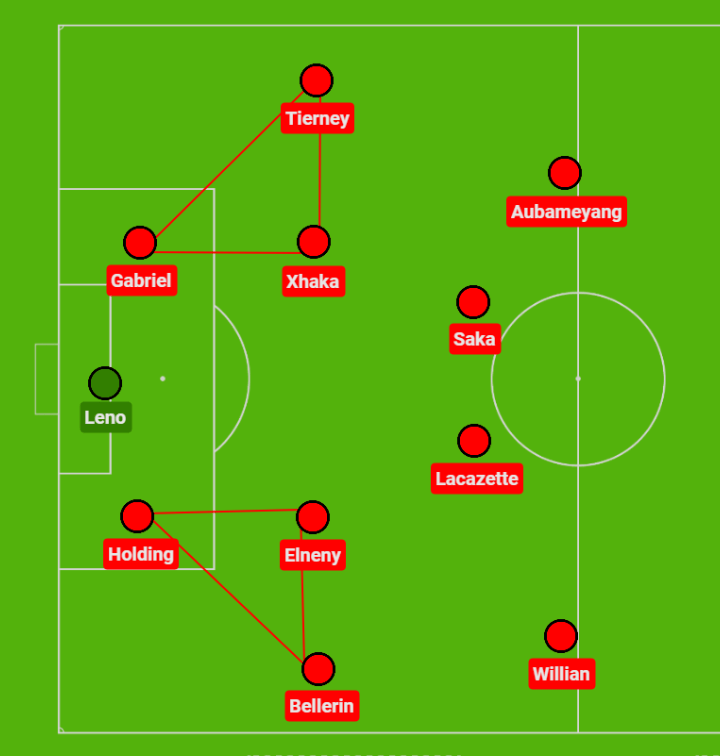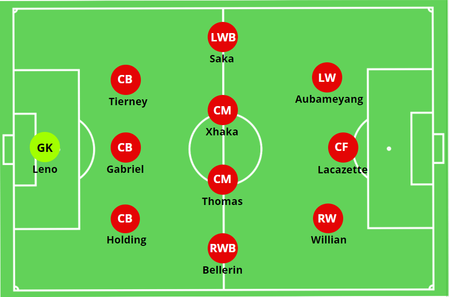 Although Arteta is often hard to peg down to just one formation, the Gunners have operated in a 3-4-3 most often this season. With the arrival of Thomas Partey, and David Luiz having someone stronger to play in a back-four with in Gabriel, Arteta may soon shift to a 4-3-3 on a regular basis in due time. But for now, the 3-4-3 has been the Spaniard’s first choice formation, as it was toward the end of 2019-20. The system incorporates Kieran Tierney as a left-sided centre-back rather than his usual left-back position; but that is basically the only player to actually play a bit out of position from where they might expect to be otherwise. Bernd Leno’s fully established himself as Arteta’s number one choice in goal again after Emiliano Martinez’s surprise departure for Aston Villa. Rob Holding and David Luiz have battled for a place at right-centre-back, alongside Gabriel and Kieran Tierney, who have been two of Arteta’s more un-droppable players this season. Hector Bellerin looks to have found his niche as a right-wing-back, while the versatile youngster Bukayo Saka has established himself in the team on the left. Thomas Partey will be Arteta’s first choice midfielder once he returns from injury, while Granit Xhaka continues to struggle despite greater pressure on him to perform with Dani Ceballos and Mohamed Elneny pushing for a starting birth. The front-three has been relatively consistent, particularly in the 3-4-3, incorporating former Chelsea man Willian, and the dynamic duo of best friends Pierre Emerick Aubameyang and Alexandre Lacazette. Arsenal do some rather interesting things in this formation, which we will examine over the course of this article. The first of their intriguing tactical nuisances under Arteta comes from their build-up, a.k.a. when playing out from the back.