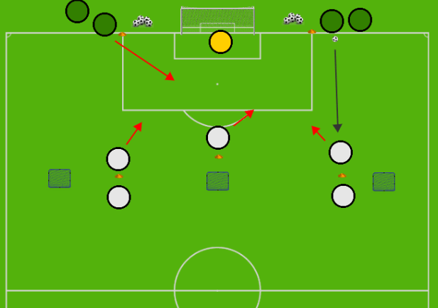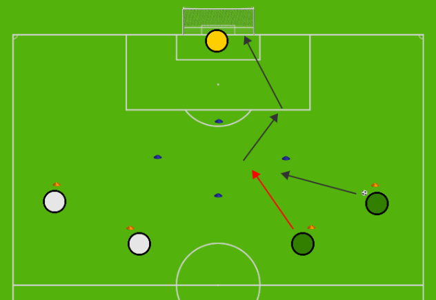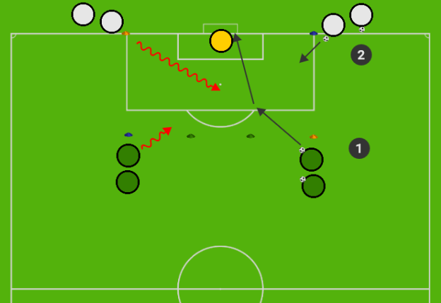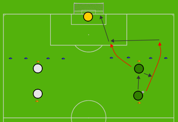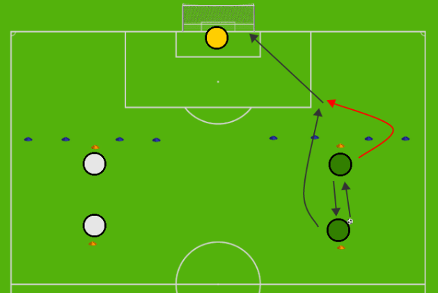 Progression: After the give and go, Green 2 has the decision to either cross or shoot. Make it a competition later on.