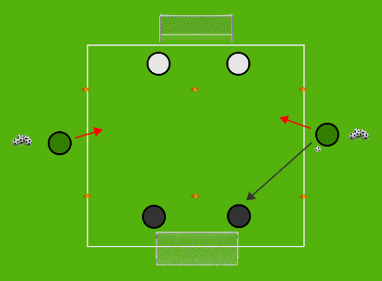 Progression: Add in a 2v1 before the 2v2. The 2v1 occurs between the player at the top of the box on the blue cone and the player who has either just shot or lost the 1v1 against the white defender on the orange cone. Then after 2v1, play 2v2. This means another set of balls will need to be added at the top blue cone.
