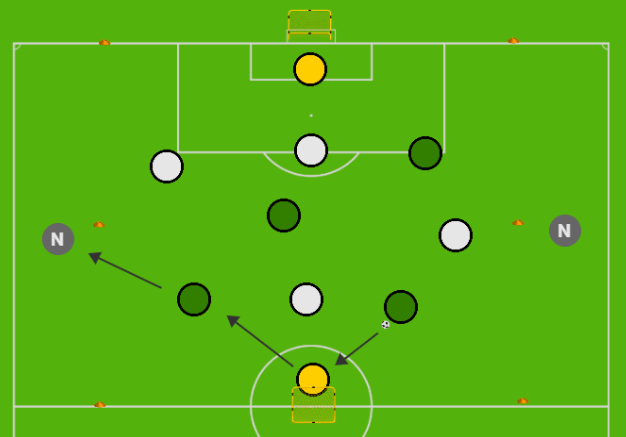 Setup/Execution: 4v4 game in a tight, narrow area with 2 outside neutrals. When a team gets scored on, they become the neutrals and goalkeepers as the neutrals and goalkeepers form the new team of 4.