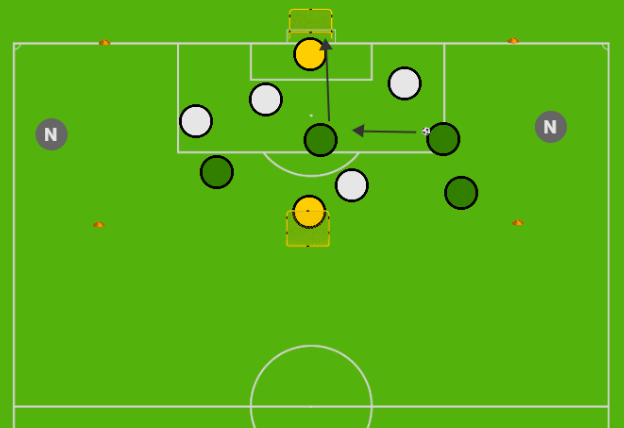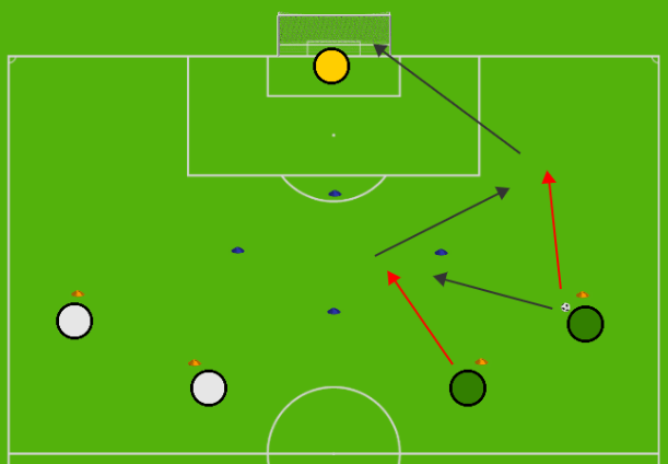 – Green 1 now makes the decision of first touch and shoot, or playing wide to Green 2.