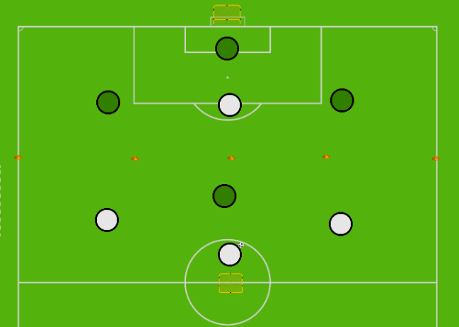 increase the advantage. Play in your own half to try and go forward at the right moment either through a pass into attackers or a shot. At any time attackers in other half can score on a rebound or through pressing