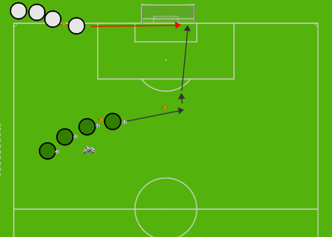 I’ve never been a big fan of shooting & finishing session plans, as they often involve activities with loads of wait time, and take up too much time for something that happens actually relatively infrequently in games. Instead, I’ve preferred to work on shooting & finishing with players in 1on1 or small-group training sessions, where the repetition can still be high and the waiting time low. That said, players love shooting & finishing sessions. Who doesn’t like to shoot and score goals? All players enjoy these sessions, even goalkeepers and defenders as it means they get opportunities to do what they love too. So with that, here is a variety of shooting & finishing activities to help you design your own shooting & finishing session with individuals or groups. The activities are separated between the amount of repetition and wait time, helping you make a distinction between which might be useful for smaller numbers and which can be done in team training.