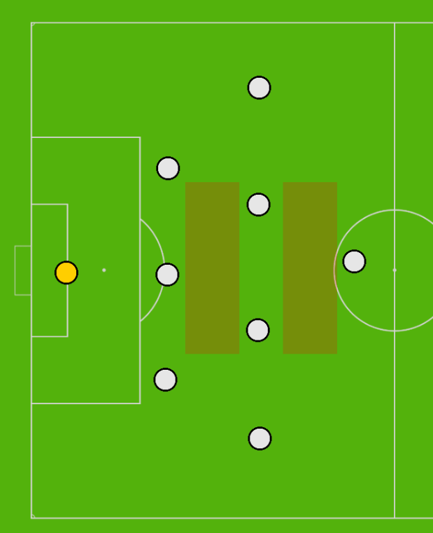 The 3-4-1 formation is one of the more defensively compact 9v9 formations. As a result, there is no obvious gap to exploit on first glance. Teams looking to exploit the 3-4-1 when in possession should look to a few key areas of the field.