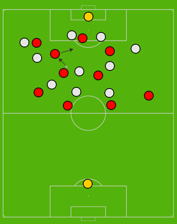 Pressing can also be oriented towards a “man to man” approach. Sides like Marcelo Bielsa’s Leeds United or Gian Piero Gasperini’s Atalanta, specifically man-orient their players up against specific individuals in the opposition’s roster. This allows the press to be systematic in a different way. Quite simply, if your player has the ball, it is your job to pressure them. If your player has drifted to a particular side, it is your job to follow them. This can have limitations, such as the defensive midfielder (say Leeds’ Kalvin Phillips) following their marker, the opposition’s attacking midfielder (say Bruno Fernandes) to one side of the field, and leaving a massive gap for another opposition player (say Scott McTominay) to exploit. But it can also be an effective method for pressing. Man-orienting in the press decreases confusion for all players involved. It also means that passing options can be very limited. As opposed to trying to cut off passing lanes such as seen when players orient themselves in front of a player, man-orienting means that if a player receives the ball, they often have a pressing player instantly on their back.