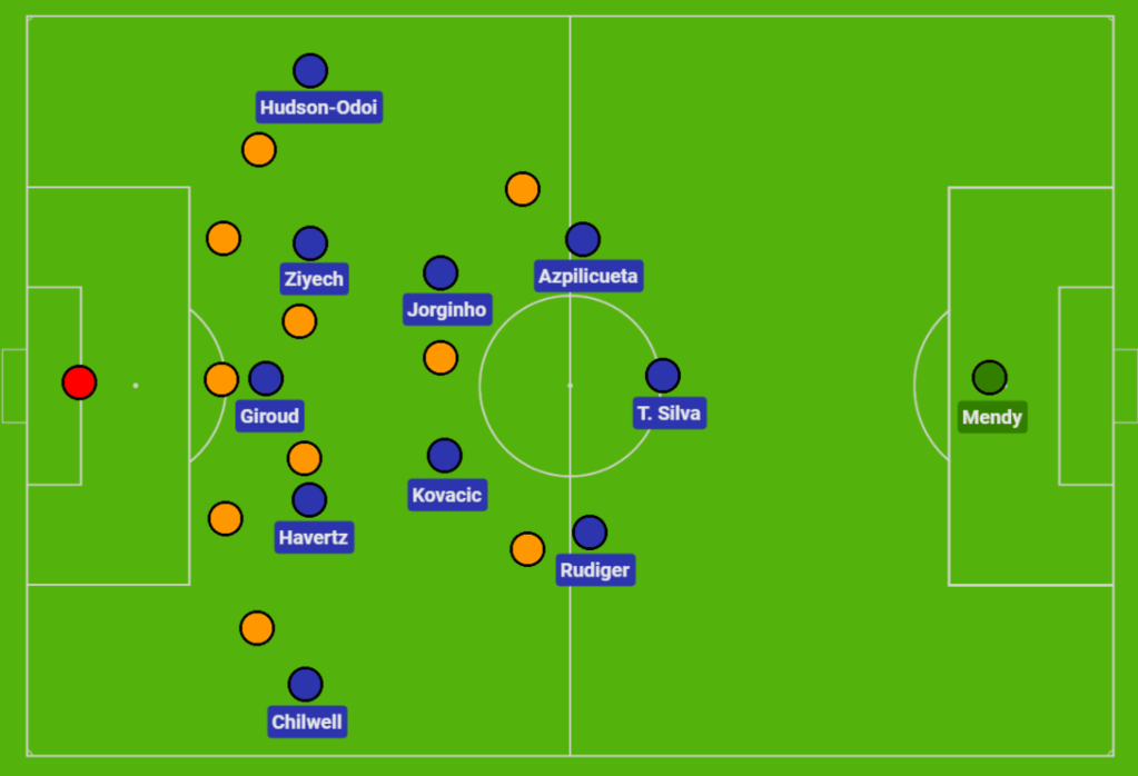 Embed from Getty ImagesCallum Hudson-Odoi played an intriguing role as the right-wing-back in the side, staying very wide throughout the match and looking to beat his man and put in crosses at every opportunity. Ben Chilwell played as the left-wing-back and played more inverted passes into central areas, rather than the 1v1 crossing game Hudson-Odoi deployed. Hakim Ziyech, Kai Havertz and Olivier Giroud made up the rest of the attack in central areas. It was more 3-4-3 in this sense than 3-4-2-1 as Giroud didn’t operate too detached from Havertz and Ziyech, both of whom rarely dropped deep to pick up possession as would be expected in a 3-4-2-1.
