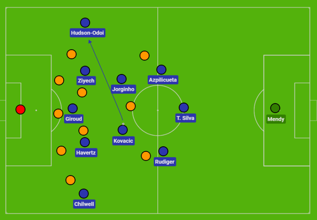 Their role in the team was mainly to spread the ball wide to Chilwell or Hudson-Odoi, but they were always on the move in shuffling left to right regardless of if they were in possession or out of possession. After spreading the ball to the wide areas (and Chelsea played with as much width as possible), the two wing-backs had differing roles. Hudson-Odoi mainly looked to take his opposite number on 1v1 and was very successful in the first half at beating Rayan Ait-Nouri with every opportunity. His crosses were of high quality in the first half, and his twinkle toes were on full display. Ben Chilwell on the other side saw more of the ball in the second half, but rarely looked to deliver the ball into the box. Instead, he linked up with Kai Havertz who operated as the left-attacking-midfielder and Mateo Kovacic to switch play to the right.