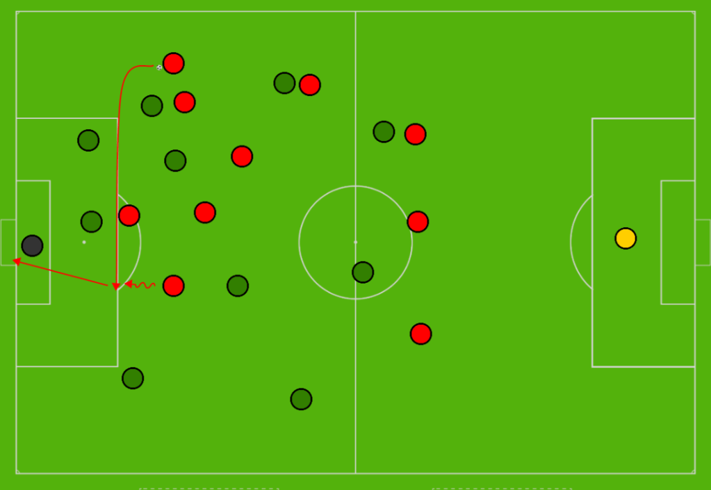 The striker and right attacking midfielder here work in tandem to shepherd the opposition player back toward their own goal as the first two involved in the press. The central midfielders have also moved up into advantageous positions, before the opposition midfielders even have time to react to their movement. They’re not just looking to cover space and opposition players around the ball, they’re also thinking about where they’ll be when their teammates inevitably win possession. You can also take notice of the left attacking midfielder, who is in a great position to get on the end of a cross should Salzburg win the ball. Conveniently, that’s exactly what happens. The Austrian giants win the ball, cross it in and score immediately.