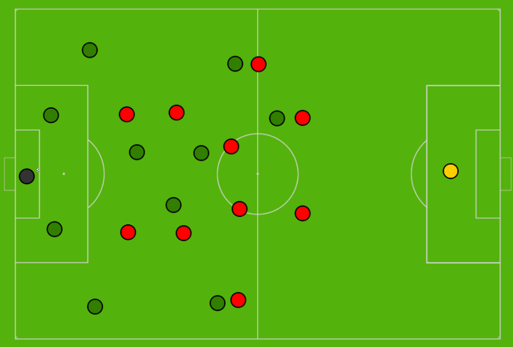 The final topic of note when it comes to their pressing structure is what Jessie Marsch describes as “the net”. The net is typically used as a method of counter-pressing, by which all ten outfield players remain in close proximity to one another and form various triangular shapes surrounding the player on the ball. Fullbacks in the team also remain reserved rather than taking a gamble to rush forward or stretch the field. They stay behind the ball, covering opposition players who might become dangerous should the other team win possession. As will be highlighted in the next section, this means that they have greater ability to attack vertically, without ever needing to rely on switches of play or horizontal runs. The net has several attacking benefits, but the primary reason for its creation is more about counter-pressing, which basically means how the team set-up to thwart potential attacks when they are in possession of the ball. In other words, it’s what TheMastermindSite calls proactive defending, preparing for what might happen if things don’t go as planned. AC Milan for example rarely engage their central midfielders terribly high up the pitch, allowing for greater cover in central areas should their team lose the ball. Salzburg utilize this net structure by constantly remaining compact and moving together as a unit whenever they are in possession. This is more typical of the side when they are in longer spells with the ball, as in an ideal world they would look to attack at far greater speeds than would allow all ten players to catch up and create this net. This net therefore has benefits in allowing the team to combine in tight areas and play through an opposition team sitting deep in more of a mid to low block. Ideally, Salzburg are never in a position where they actually need to create this net and rely on counter-pressing, if everything is going well for their counter-attacking. So with that, if you are interested in hearing more about how Salzburg attack, be sure to check out our full Jessie Marsch – Tactical Analysis.