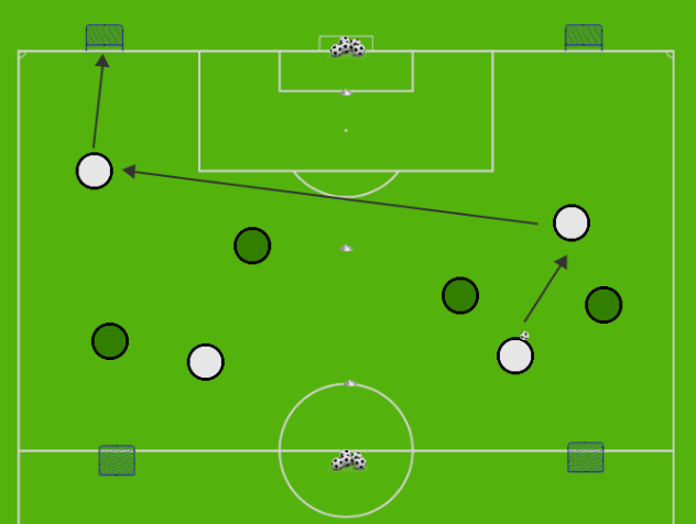 Setup/Execution: Regular game except goals are in middle of pitch, facing out toward the touchline. After winning the ball from the opposition, the team must switch play before the halfway line to the other side before scoring. Now the team can score on either side depending on their perceptions of space, opposition, teammates and ball. For added fun, a goal within ten seconds after winning the ball can be worth three points.