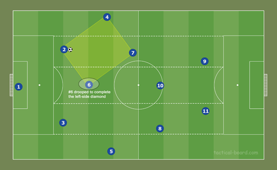 In the diamond, the #6 has the most important role, as they can be involved at the base of an attacking quartet, or at the top of a diamond that incorporates the two centre-backs and goalkeeper.