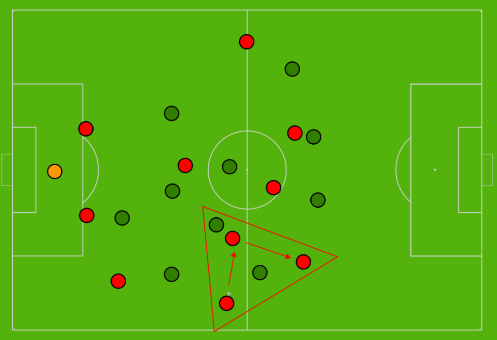 The back-three and central midfielders will be particularly key to implementing this, and work to combine together through triangular combinations. The centre-backs will often spend more time on the ball than anyone else, circulating it around and remaining patient that they’ll work the right moment to play a pass into a wide area. Once a ball is worked into that wide area, another triangular combination of striker, wing-back and central midfielder will combine to overload one side and free up one of the three players higher up the field in space. As a striker floats deep to pick up the ball, a central midfielder may even be the one to advance up the pitch at the top of the triangle, creating chaos for the opposition. Once advancing into the wide areas, they rarely look to switch play back over to the other side. If they do change the point of the attack, it is more likely to occur higher up the pitch, such as through cross-field passes from one wing-back to another.