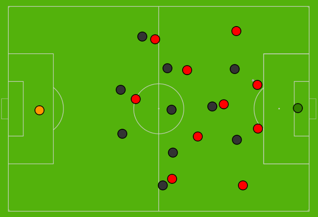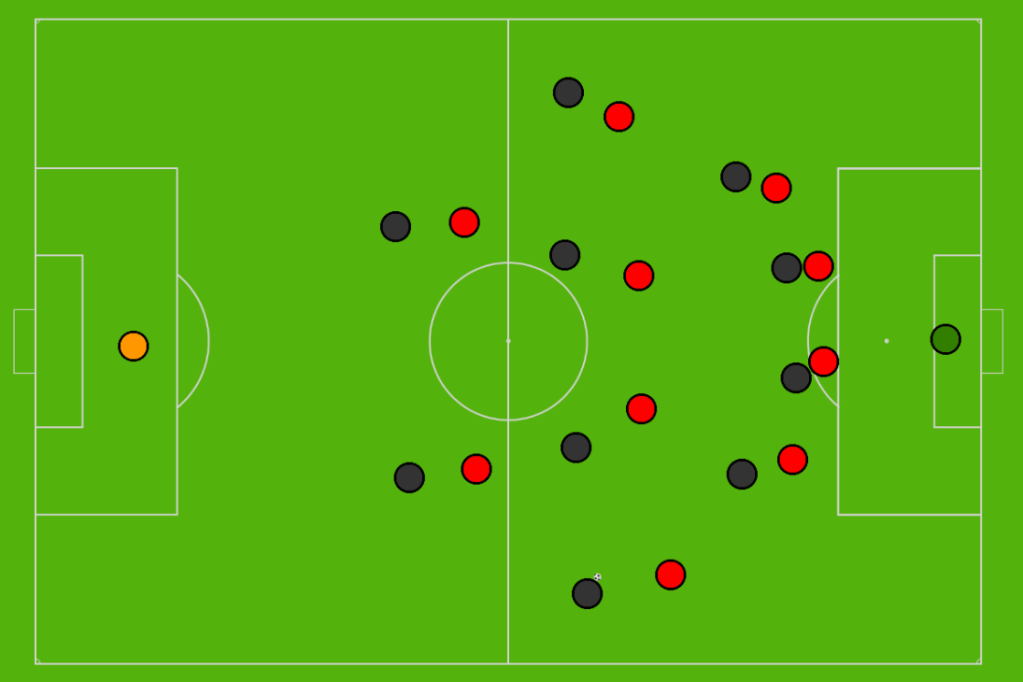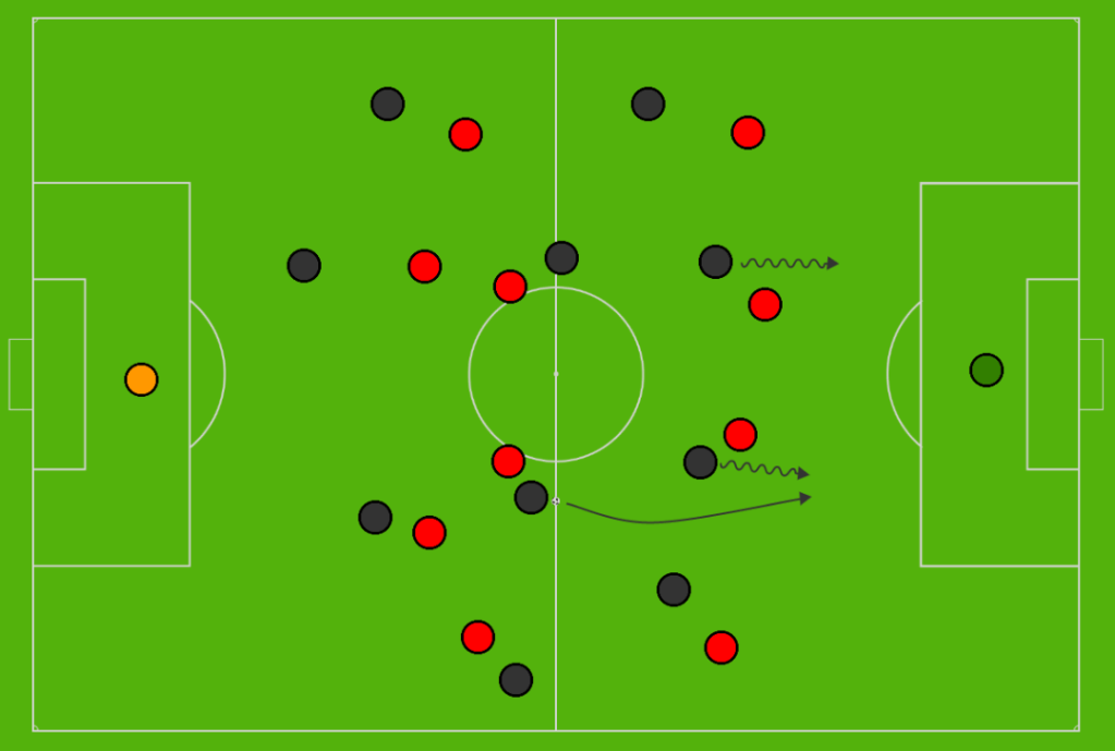 Against a midfield three, Seoane may adapt his principles of play to look more like 4-3-1-2 in the press, as one central midfielder pushes up to stop the opposition’s defensive midfielder. The fullbacks will then remain locked on the opposition wingers/wing-backs, as the wide men invert inside as part of the pressing trio. Crucial to the process are the front two, who often move left to right together and look to cut off passing angles into wide areas, and force the opposition inside to the central midfielders to pounce.