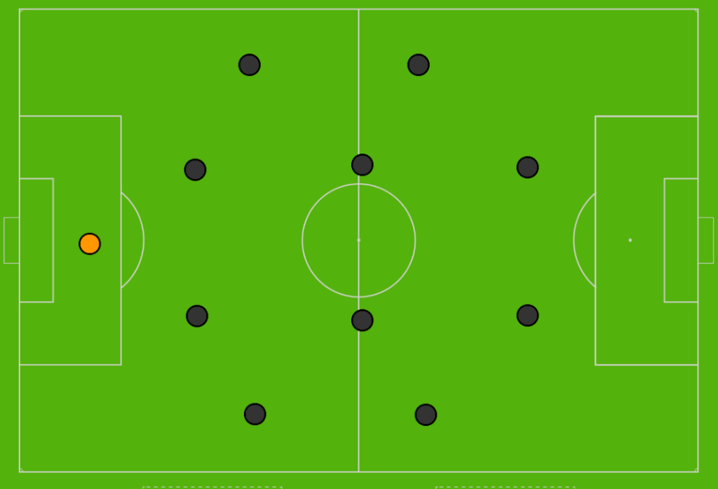Crucial to the way Seoane plays is a particular narrowness in both attacking and defensive phases. The width in attack often comes from the fullbacks as the wingers invert. This aids in the team’s long ball approach as they tend to hit passes from deep into the narrow front four. In defense they also look to remain narrow, in a compact 4-4-2 block.