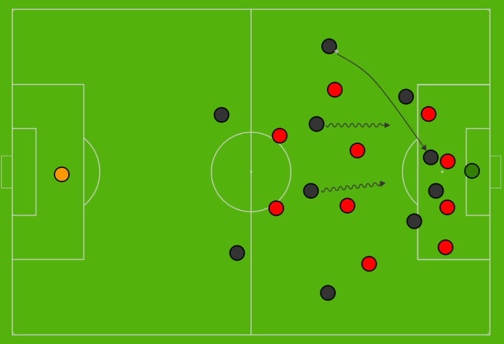 In build-up phases, the positioning of the central midfielders to come deeper towards the ball is often one quick route by which Young Boys open up space to hit these longer passes into wide channels, where strikers are ready to run in behind or wingers remain inverted. Then despite the narrowness of their attack, they also like to maximize their delivery of crosses, such as from the wingers, fullbacks or central midfielders. With the wingers inverted and dropping deep, the fullbacks often have loads of room to advance in the wide areas. This can be seen even when delivering long passes from deep, as the fullbacks push much higher up the pitch than you might expect of a team playing 4-4-2.