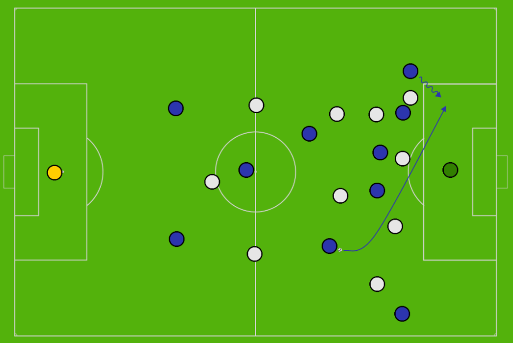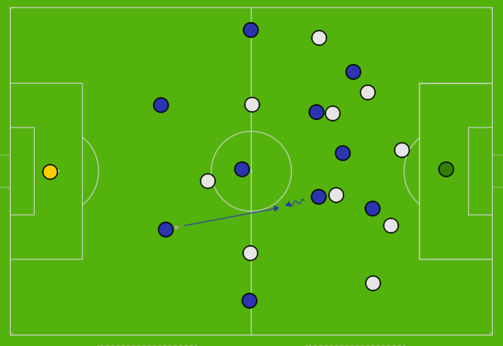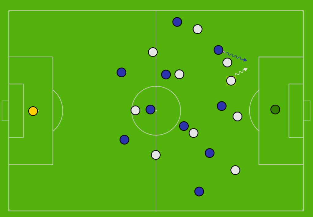 As Varane and Kimpembe moved the ball around, the fullbacks progressed higher in the same line with Kante, and the central midfielders pushed up to receive in between the lines. Griezmann also buzzed around and often dropped in, providing another option for vertical passes. When progressing into the final third, both fullbacks could often be found higher up and adding additional chaos to that mix, as France attacked in numbers. Within this shape, they relied on magic from Pogba to pick out smooth passes from right to left at the most opportune moments, and also looked for potential passing interchanges between the narrow front three who again operated in close proximity.