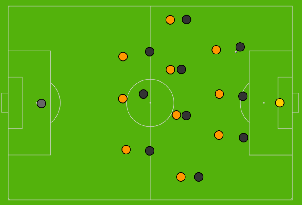 In terms of their high press (on longer spells without the ball, and goal kicks), Netherlands shift into a 3-4-3 shape. This involves Wijnaldum taking up a position on the right of the front three rather than the central role he holds in possession. This adaptation is actually quite common for teams playing 3-4-1-2 like Mainz and Atalanta and similar approaches of a front three high block are taken by teams like Everton and France who play with a free roaming right winger in possession and then shift them back out wide off the ball. What this allows for the Netherlands specifically is several advantages. Firstly, it allows Wout Weghorst – as the supposed main goal threat and target man – to continue operating in central areas rather than out wide when defending. If Netherlands win the ball, he’s a great outlet to have with his exceptional link-up play as well as size and strength, and having him in the middle is therefore the best place for him to be. If the press is broken, Weghorst can then again stay high and central, as the more mobile Gini Wijnaldum and Memphis Depay track back instead. The second advantage of this defensive shape is that it is fantastic for creating defensive triangles in wide areas. That could be from wing-back, central midfielder and winger combining, or from the outside centre-back instead if the press is broken…which Netherlands usually don’t allow. If teams try to play centrally to combat this, they face the task of two outstanding ball winners in midfield. If they go long, they face three aerially solid defenders, and wing-backs with more than enough recovery pace to help chase down any loose passes. When done right, there is simply no way past Netherlands’ press.