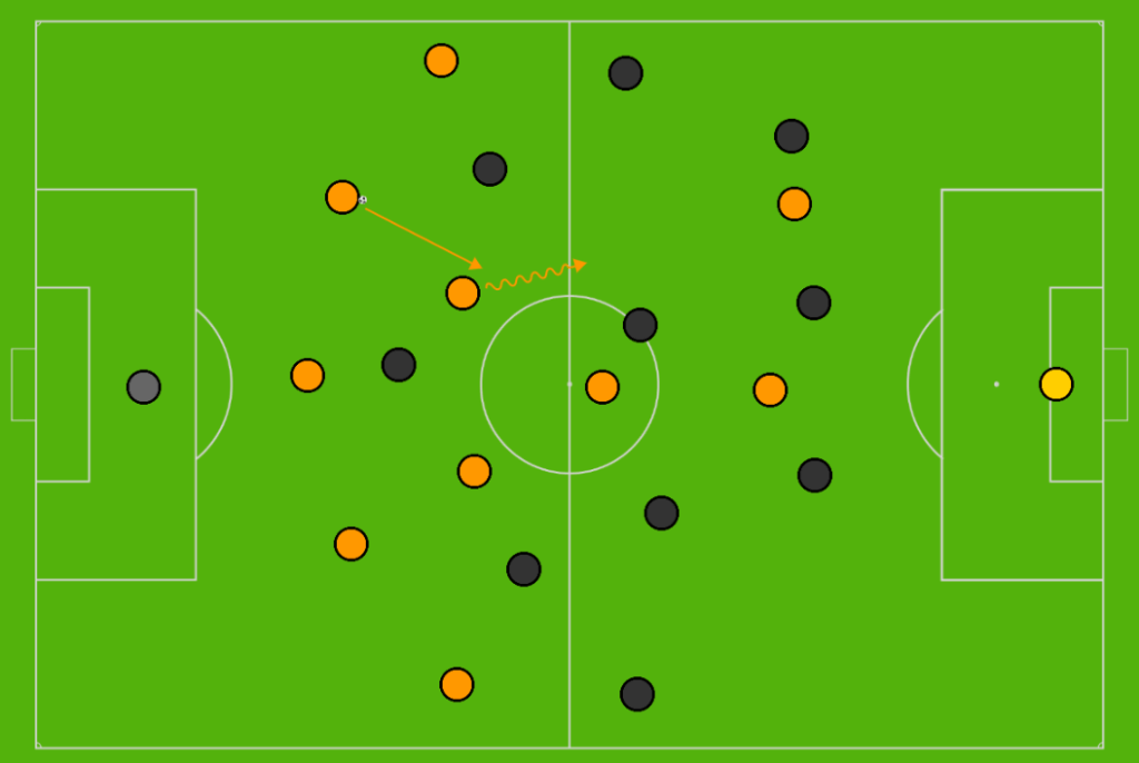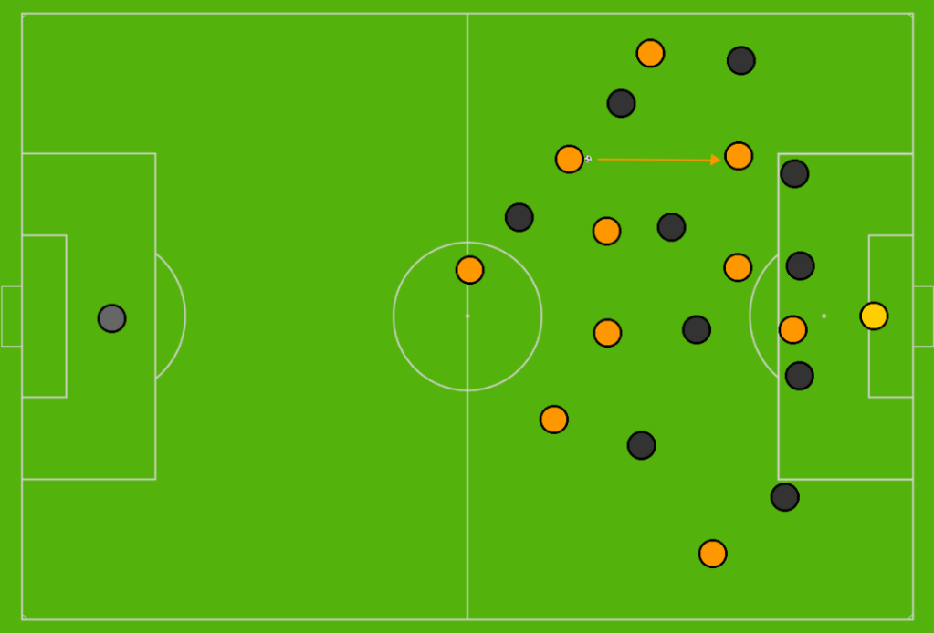 Once advancing into the opposition’s half, it is also very common for the centre-backs to do so as well. Daley Blind in particular will advance down the left and look for moments to play in Depay, but de Vrij has also shown great dynamism in galloping forward from his position on the right of the three. Blind also likes to play longer passes, which can be effective for the Oranje in switching quickly to the right and engaging Dumfries, just as the opposition try to set up how they are going to defend left-sided Depay. By having so many players remain in close proximity in their build-up like this, particularly once advancing into the opposition’s half, it makes it very difficult for opposition sides to transition. We spoke about the same trend with Italy at this tournament, and it’s no surprise to us that many think of these two sides as the most dominant of the Euros so far.