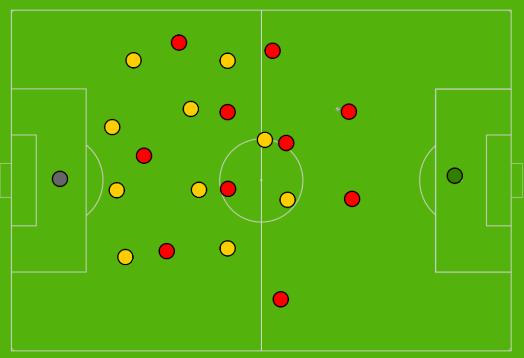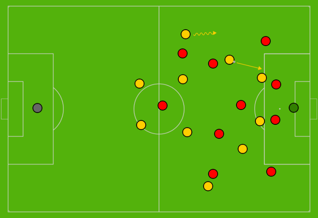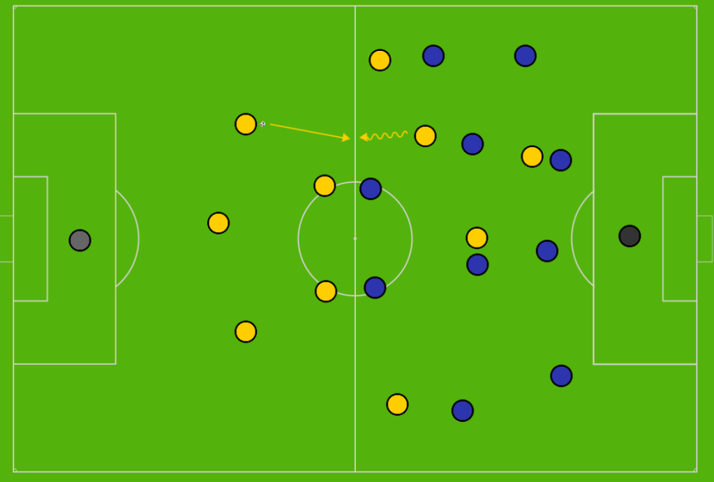 Another key tactical note of Sweden’s defense is that their first mechanism for counter-pressing is usually the player that loses possession. If a pass is misplaced by the fullback, it will usually be that fullback who pressures immediately to win the ball back. If the Swedes become unsuccessful at regaining possession, they will resort back into their 4-4-2 shape and shut down the gaps. But their first instinct isn’t just to drop and find their shape again, instead to put pressure on the opposition, and look to win the ball back if they can.