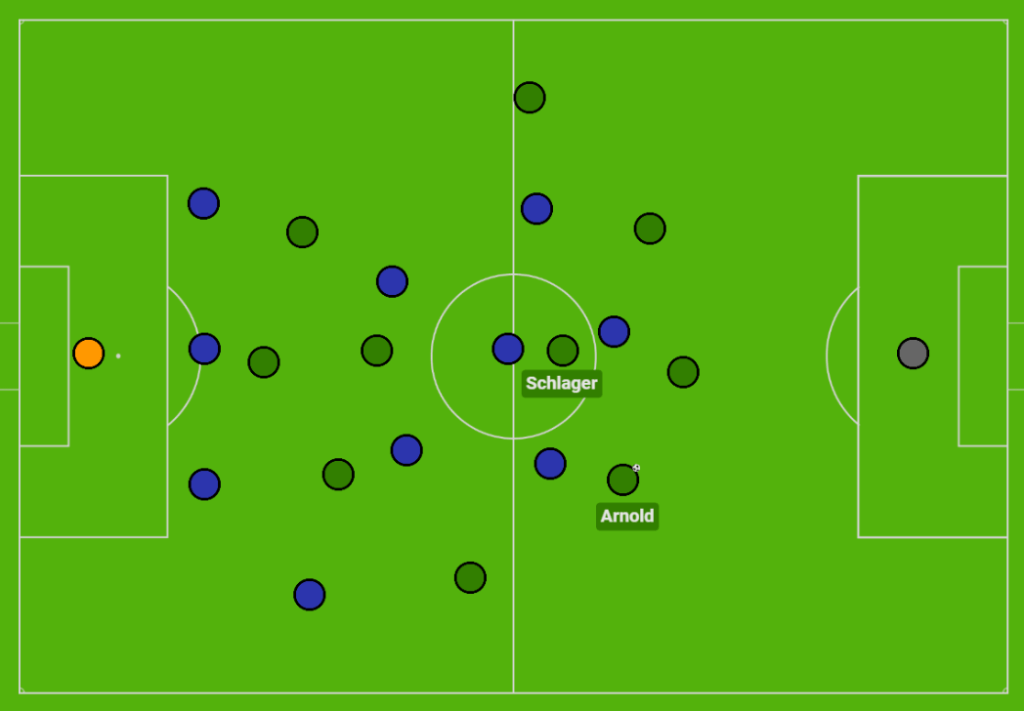 Wolfsburg, for the second week in a row, built out from the back with a greater emphasis on possession and keeping the ball than under Oliver Glasner. They utilized a similar diamond structure to Jurgen Klopp’s Liverpool, which involved Max Arnold dropping into the left-half space to form a triangular three with Maxence Lacroix on the right and John Brooks through the middle. They then used Schlager at the top of the diamond. But again, they couldn’t get the Austrian on the ball enough, and usually either went wide left to Roussillon and Breaklo/Steffen, or continued passing the ball around in that triangle.