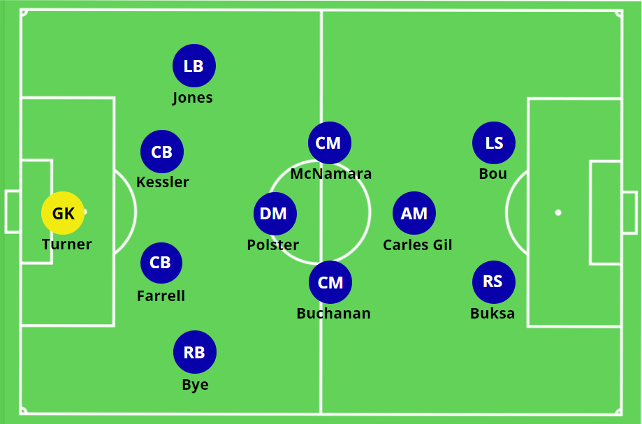 Depending on the opposition, New England may look to engage one side more than the other, attempting to exploit their opposition’s weaker side. This allows both fullbacks to be equally important members of the build-up and beyond, where Tajon Buchanan can float between both sides of the field and connect higher up. Bye and Jones are both solid progressive passers, and will look to make vertical passes whenever they can into the wide channels. These connections can be for strikers to run onto, especially when timed right, or they can be inside to Buchanan or Gil to then dribble at speed and work magic higher up.