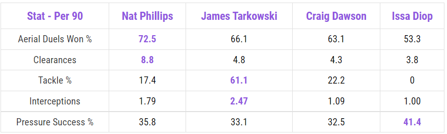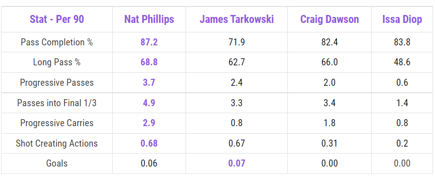 Nat Phillips’ defensive stats excel above his colleagues, and even in a possession heavy Liverpool side, the 6’3 defender still put up positive numbers. He places first or second on all but one category (tackle %), with a massive aerial duel percentage that would suit West Ham’s set-piece prowess incredibly well. His tackle % is not drastically different from Dawson’s in that one below par category, and significantly better than Issa Diop’s. Meanwhile, he beats his fellow defenders on pressures applied by quite some margin, again in a Liverpool team with a lot of possession, which was accompanied by a higher success rate for his team than Tarkowski and Dawson. Tarkowski would be an excellent defensive acquisition, but he’s also 29 years old, compared to Phillips who at 24 is yet to reach his peak.