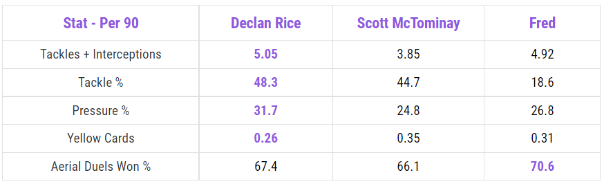 If you haven’t bought into the idea of how remarkable of a footballer Declan Rice truly is yet, look no further than his defensive output. While West Ham are a team who have more defending to do than Manchester United, Rice’s numbers stand out when compared against just about any midfielder in the league. His interception numbers are in fact the highest in the league, and when you look at things like percentages instead of volume, he still outperforms his competitors. Tackling nearly 50% of those trying to dribble past him would be a welcomed addition to the team, especially when compared to Fred’s abysmal ratio of 18%. Moreover, his pressure success also shows the signs of a player fully capable of playing in a high pressing team. He’s also proven to be more disciplined than the often overzealous Fred and McTominay, picking up only 0.26 yellow cards per 90. Despite being a tall lad, the only category he fails to win in our data search is ‘aerial duels won percentage’, but he’s competed in nearly triple the amount of Fred, who somehow wins the category from having won 12 of his headers.