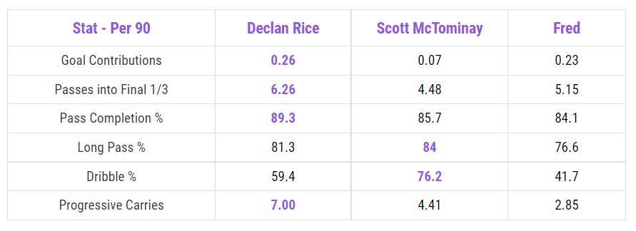 Embed from Getty ImagesWhen looking at the strengths of Declan Rice in contrast with Rangnick’s United, it’s a match made in heaven. But the Red Devils need to identify a midfielder who can not only fit their style, but can outperform the team’s current options. So let’s take a look at how the West Ham captain compares to Manchester United’s current starters in the position – Scott McTominay and Fred.
