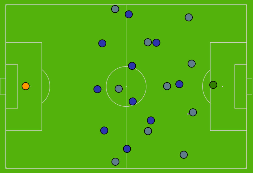 Shifting into more of a 4-1-4-1 in their mid-block, City continued their effectiveness. The defensive line remained more withdrawn as the midfield did all the hard work in front of them. The intense pressure attracted the likes of Kovacic and Kante deeper toward the ball, and so too the attacking midfielders ahead of them. This meant that Chelsea were forced to go long, and then didn’t have much in the way of support even if they were able to win the initial header. Then on the rare occasions Chelsea were able to break quickly and go on the counter, Bernardo and Rodri were always well positioned to break it up. The midfield pairing were extraordinarily combative once again in front of their back-four, and City’s high-line meant Chelsea could do very little when wanting to get runners in behind the back-line. On their only shot on target, Ederson stood up exceptionally well to make a strong save and stop Lukaku from scoring.