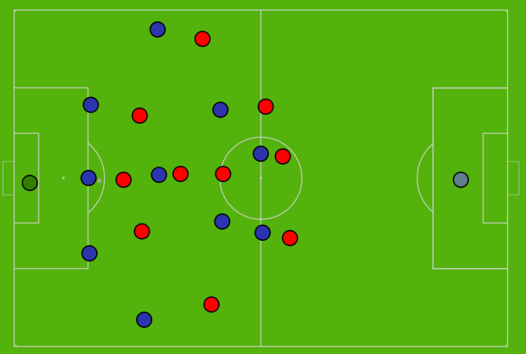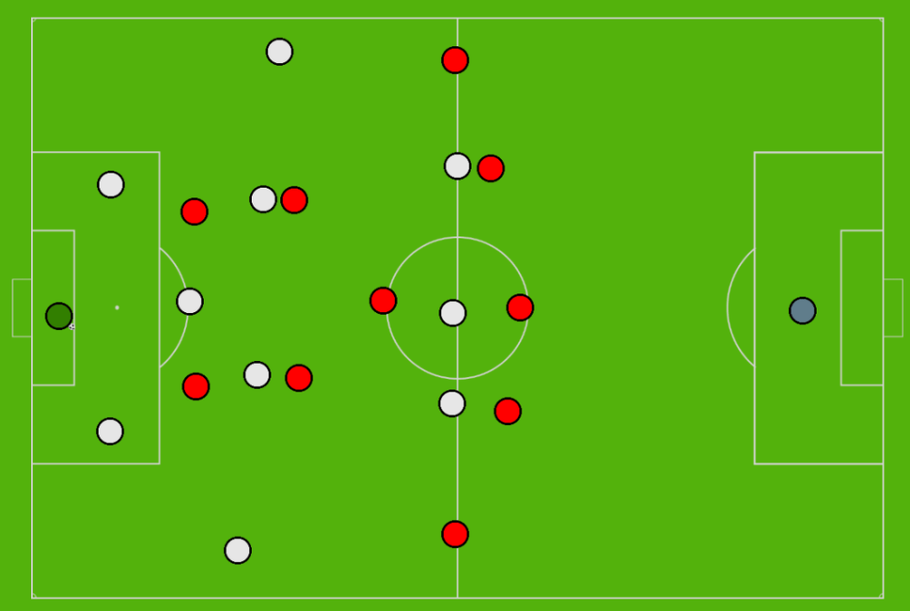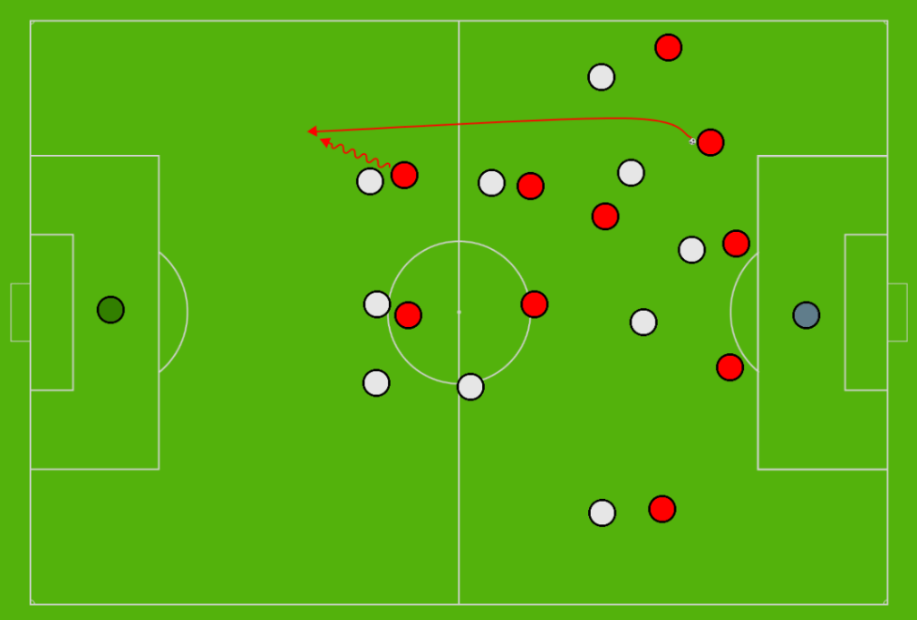 Finally, in elucidating this strategy further, initial build-up stages can even look more 5-1-2-2, as the fullbacks come in deep. They do this not necessarily to pick up the ball in the wide areas, but to create even more room for the strikers to chase balls into half-spaces. Moving players closer to your own goal pulls opposition players with you, erasing the opposition’s compactness as the target men stretch the depth. If Die Eisernen want to use the wing-backs then as additional options, you could expect the attacking midfielders to receive next on a one-touch diagonal into half-spaces, where the forwards can then receive in space. Altogether, Urs Fischer’s build-up strategy is incredibly effective, versatile, and shows a clear understanding of the team’s strengths, and ability to lean into those opportunities.