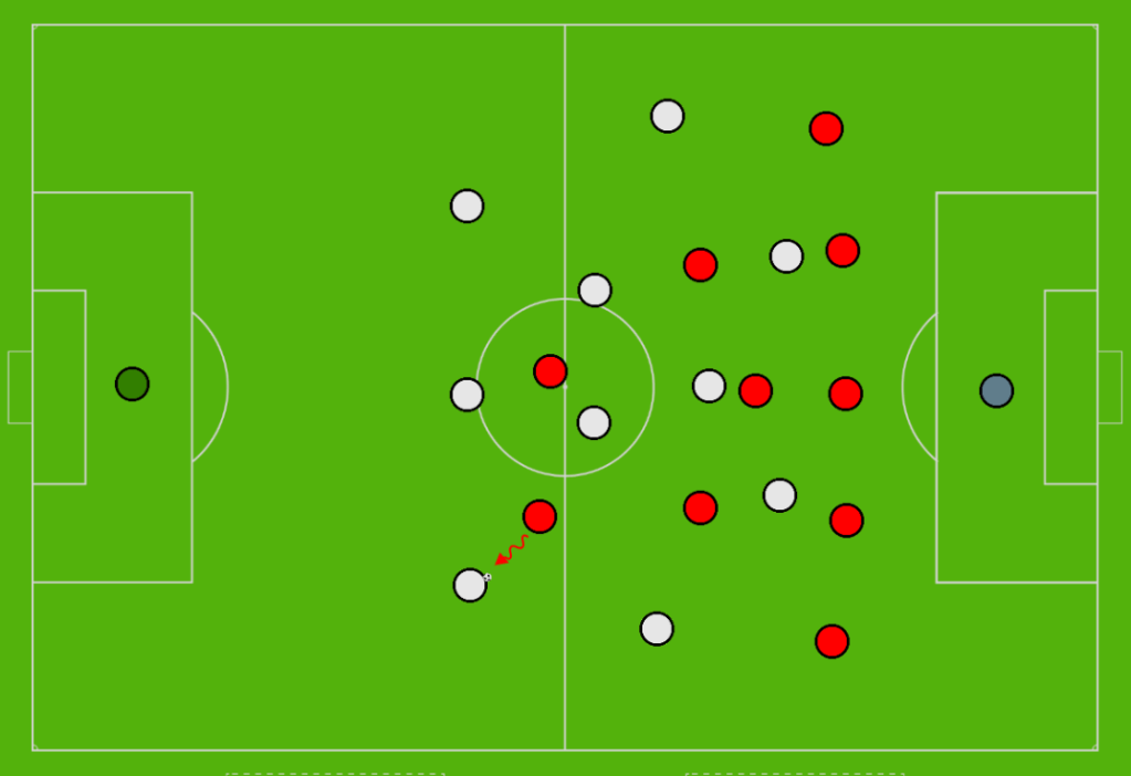 With hard-working strikers on-side, shuffling and pressuring from the front, the opposition may be forced into making long passes and losing the ball. It’s not uncommon for one striker to drop behind the other and screen the opposition’s number six, facilitating the forcing wide.