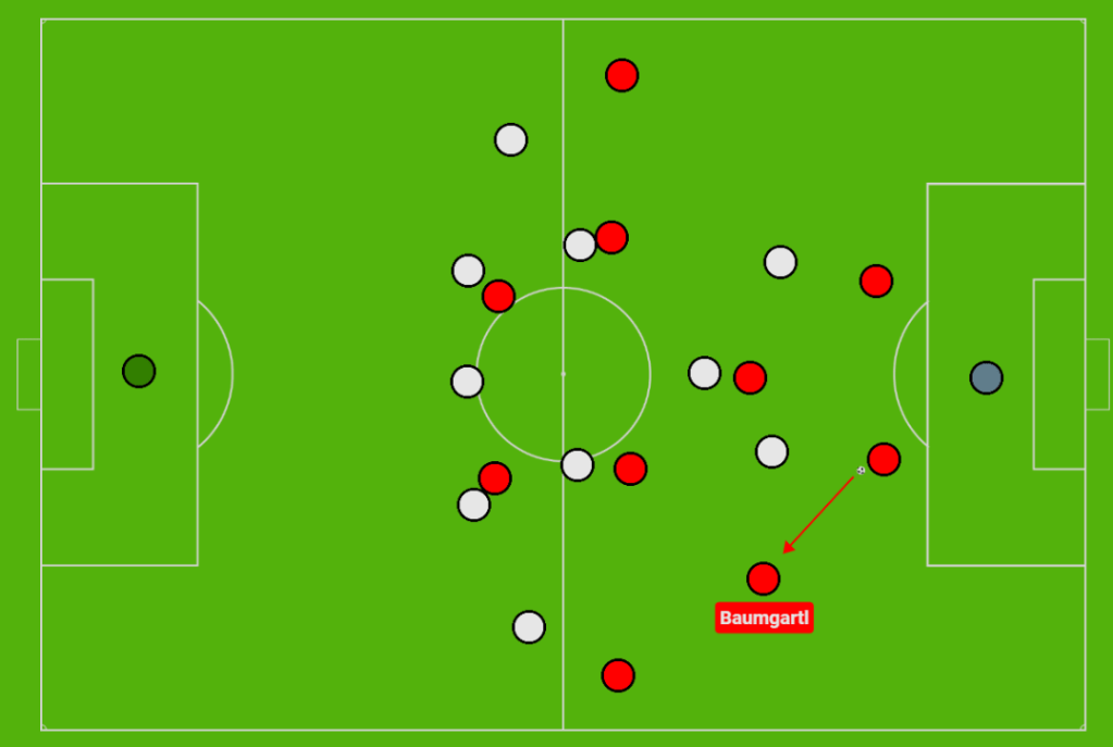 The back-three will usually interact with a narrowness between them, with minimal angles as they circulate the ball. The goalkeeper and Khedira will then form the other important part of the build-up with both involved in initial stages of circulation. It’s not uncommon for all three centre-backs to touch the ball in build-up phases, as they move the opposition around and find avenues forward. One of the central midfielders may also drop deep in a 3+2 shape, as the other floats away from the situation. Perhaps most intriguingly, in some moments, one centre-back pushes higher. When the goalkeeper has the ball, the middle centre-back will often float into more of a defensive midfielder’s position in a 2+2. Baumgartl on the left meanwhile will look for moments to carry or advance forward ever so slightly. This could mean Khedira dropping into the back-three instead, or a lopsided 2+2 as the team look to advance down the left.