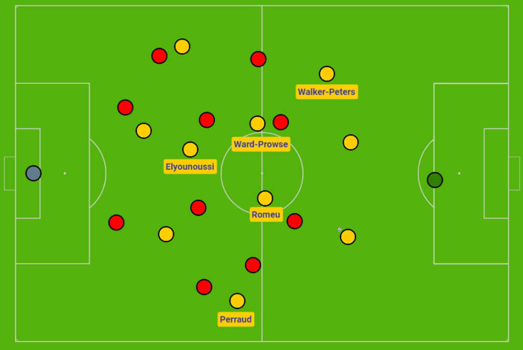 For most of the game, the Spanish midfielder operated alongside Ward-Prowse in a 4-4-2 defensive block, shuffling with the play. Then in Southampton’s 3+2 progression, Kyle Walker-Peters joined the centre-backs, and Romeu and Ward-Prowse situated themselves in front. As Mohammed Salisu stepped out or carried the ball forward, the 30-year-old midfielder would then cover in behind. This was all very standard and normal. But the same cannot be said for Southampton’s brief experimentation with a 5-3-2, whereby Romeu became the sweeper in the side.