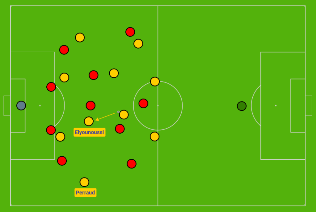Romain Perraud played like the left winger in attack instead, with the Norwegian constantly operating in central areas, behind the front two. Immediately after winning the ball, the central midfielders would then look to go direct into Elyounoussi’s path as he situated himself in between the lines. The strikers could then create holes in the defense by shifting wide, where balls over the top could have been used to create further advantages. Importantly though, in other moments Che Adams could drop in deep instead, as Elyounoussi floated higher, showing some degree of genuine rotation.