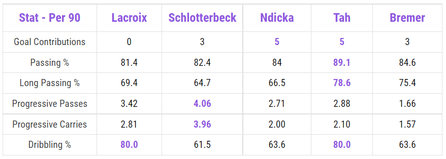 When it comes to defensive contributions, we see a more even spread in the leaderboards for our centre-back contenders. Maxence Lacroix and Jonathan Tah both win two categories each, with Tah’s in particular matching well to Dortmund’s style again. His impressive tackling success rate of 65% means the Black & Yellows can continue to push Raphael Guerreiro further forward, knowing they have a defensive beast in behind who can sweep up the messes. He also competes extraordinarily well in the air, beating Hummels’ aerial duel percentage by over 10%.