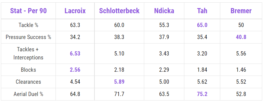 Embed from Getty ImagesBremer’s pressing percentage is encouraging, in addition to his interception numbers which vastly stand out from the rest. But stylistically, it’s clear that Schlotterbeck, Lacroix and Tah would make for more natural fits. Obite Evan Ndicka meanwhile achieves high scores in several categories and still stands out among most defenders in the Bundesliga, but in our particular analysis, the stats suggest he might not be ready for the big jump quite yet. At the end of this, a clear winner has emerged.