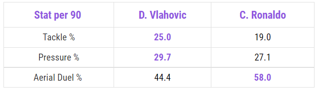 Embed from Getty ImagesSince Juventus are not a team that ask an awful lot of their centre-forwards defensively, (particularly their star man), we’ve examined only three of the most important percentage points. It’s important to note that aerial duel % takes into account both defensive and attacking aerial duels, even though we’ve categorized it with other defensive statistics.