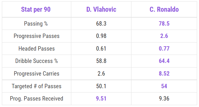 Again, Cristiano Ronaldo comes out on top in nearly every category, smashing Vlahovic when it comes to progressive passes and carries. However, he compares well when it comes to being a focal point that the team can target, and on receiving progressive passes into his path. Remarkably, if you only take his numbers at Juventus into account, he blows Ronaldo out of the water in that regard. He’s been the target of 56.3 passes per 90 so far at Juve, receiving 14.2 progressive passes per 90, even despite Juve’s lack of possession (only 52.3% this season). As we talked about in Analyzing Europe’s best ‘Progressive Pass Receivers’, being able to receive these types of passes is particularly important for a team’s attacking intent, particularly when that team can guide play into a man of Vlahovic’s insane quality.