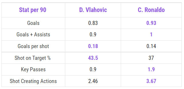Embed from Getty ImagesBeing the man to replace the legendary figure that is Cristiano Ronaldo, it’s only fitting that we compare Vlahovic’s 2021-22 season to that of the Portuguese forward’s final season in Serie A (2020-21). In order to enhance the sample size and accurately predict why he might be ‘perfect’ for Juventus, we’ve taken into account his stats for Fiorentina in 2021-22 before his January move, including his first six fixtures with Allegri’s team. Before going into the data, we must also remember that Cristiano Ronaldo is one of the greatest players to ever play the game, and was still close to his very best even last season at Juve. With that, here is how Vlahovic compares on the most statistically relevant categories.
