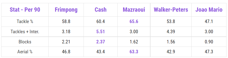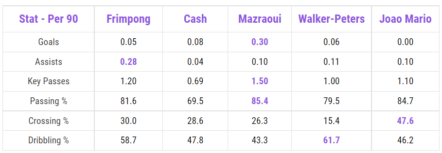 Of all the choices, Joao Mario may come out as the most well-rounded, and certainly stands out when it comes to delivering crosses – which is a crucial facet to Dortmund’s right-sided play. Jeremie Frimpong and Nazar Mazraoui however clearly stand out even more when it comes to reaching near unattainable accomplishments. The Leverkusen man wins out on assists and boasts an impressive dribbling percentage of nearly 60%, while the Ajax defender beats Frimpong for chance creation and xA (expected assists). From this data alone, Matty Cash and Kyle Walker-Peters could be ruled-out. However, we must remember the defensive need for Dortmund, and the fact that their right-back replacement should be someone that excels in that side of the game. So let’s see how each compares in round two.