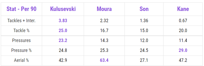 As noted throughout our analysis, the most impressive facets of Kulusevski’s game have to do with his off-the-ball prowess, and ability to contribute to all areas of Conte’s plans. The wing wizard wins on three of the categories we cross-examined, vastly outperforming his team in on-the-ball defensive actions. His tackle and interception numbers may seem low, but 3.83 per 90 compares well to others in his position, and overshadows the others in our study. His pressure numbers (an off-the-ball action) also shine far brighter than his three teammates, even if Kane accumulates a better pressure success percentage. Finally, despite not being the tallest of lads, Kulusevski completely outperforms Heung-Min-Son when it comes to challenges in the air, and compares more closely to the big man up top in Harry Kane. Lucas Moura is an anomaly of a smaller player who wins everything he contests in the air, but Kulusevski is proving himself to be a bit of an anomaly himself for his versatility in skillset. One thing is abundantly clear – when it comes to the defensive side of the game – Dejan Kulusevski is a warrior that cannot be dropped.