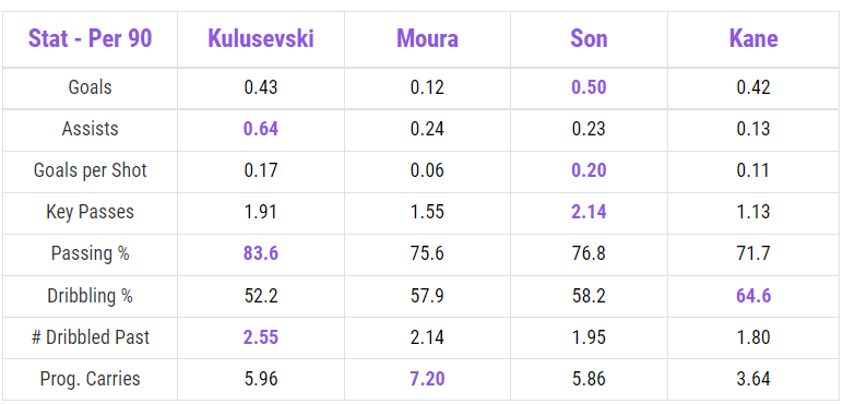 Embed from Getty ImagesIn deciding whether or not Dejan Kulusevski is truly a perfect fit for Tottenham, we’d be remised not to compare the Swede to his fellow teammates. We took to our favourite stats site FBRef to compile some of the most important statistical categories worth comparing, and weighed up Kulusevski’s strengths and weaknesses against the other most prominent members of Spurs’ front-line.