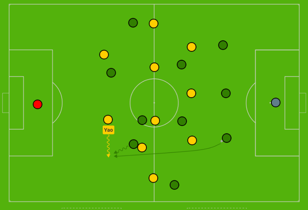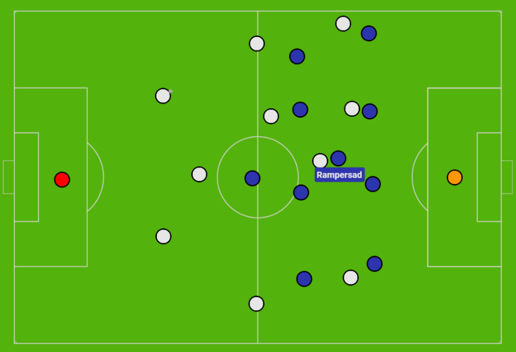 Out of possession, Wheeldon Jr.’s team pressed in a 3-4-3 shape in both their high and mid-block. In moments where Atletico were able to play passes over the top of Klomp’s slightly advanced position, Karifa Yao excellently stepped up to close down the space and deal with the situation. Out of the front three, Ali Musse was again the one actively stepping on the pedal to press high and make something out of nothing, pushing the envelope as Atletico circulated the ball. Charlie Trafford and Victor Loturi also held firm out of possession, and their sound positioning meant Atletico resorted to long-passes in order to find their strikers.