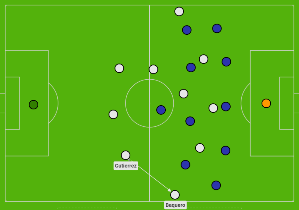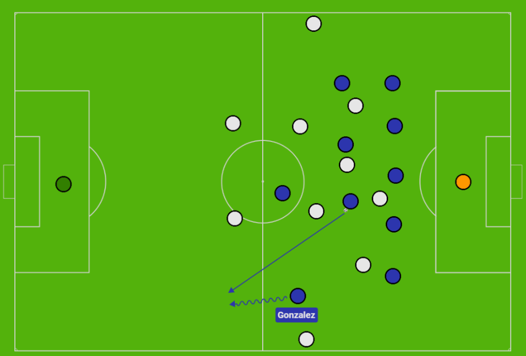 From a tactical perspective, Atletico played the most intriguing role in the match with their fluctuating changes of shape. In possession, Ottleti attacked with a lopsided 3-4-1-2, where Aleman floated into left-half-spaces, Tissot roamed higher than his defensive partners, and Tabla played high and wide on the right.
